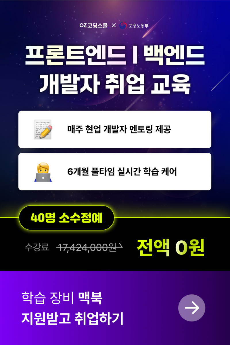 "고용노동부에서 지원하는 오즈코딩스쿨의 개발자 취업 부트캠프에서 수강생을 모집하고 있습니다. 교육비 약 1,800만 원을 지원받을 수 있으며, 6개월 동안 풀타임으로 실시간 케어를 받을 수